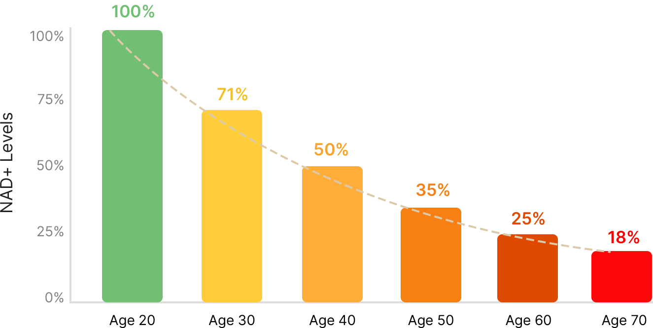 Your NAD+ levels naturally decline with age starting as early as your 30s.
